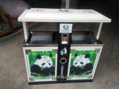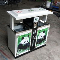 【喷涂工艺】垃圾桶经喷砂处理去油去锈后再采用户外塑粉静电喷涂, 木条表面采用抗紫外线丙稀酸油漆多层喷涂,环保图片铝牌+户外写真贴膜图案。