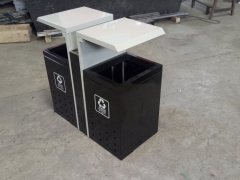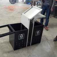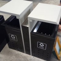 【喷涂工艺】垃圾桶经喷砂处理去油去锈后再采用户外塑粉静电喷涂, 木条表面采用抗紫外线丙稀酸油漆多层喷涂,环保图片铝牌+户外写真贴膜图案。